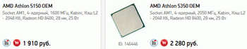The Athlon 5350 (2.05 GHz) has four cores and a TDP level not more than 25 watts, it is proposed for 2280 rubles. The Athlon 5150 differs from it in a slightly lower frequency cores - 1.6 GHz, otherwise they are identical. It should be recognized that at a price slightly above $ 50 (1910 rubles). Related Products :