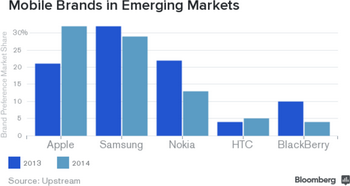 Bloomberg agency gives interesting results of Upstream in 2014 sociological survey, which covered 4,504 respondents in Brazil, China, India, Nigeria and Vietnam.  Survey participants were asked to identify those brands in the smartphone market, to acquire products they seek most.  So, the leading position compared with last year's survey took Apple 32% of the vote, pushing Samsung in second place with 29% of votes.  I should say that in the past year, Apple settled for 21% of the vote, and it is significant progress for the company, which can be explained except that the effectiveness of attempts to expand the geography of sales of the latest iPhone models  .