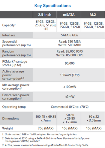 M550 series drives support hardware encryption (Opal 2.0), equipped with a mechanism of protection against data loss during a power failure, a new regime of deep sleep to reduce power consumption in sleep mode and reduce the awakening time.  In addition, the active heat management technology allows  to limit the speed in those cases where it is important to keep the temperature in the rigid framework, but this feature will be used mainly in the tablet.