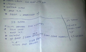 Today appeared in the Network specifications Galaxy S5 Zoom, written by hand on a sheet of paper in a closed presentation of trends in Poland.  Apparently, the new Samsung camera phone will be equipped with 20-megapixel main camera with Xenon flash, 10x optical zoom and optical image stabilization support.  Resolution of the front camera is much more modest - only 2 megapixels.  For comparison, Galaxy S4 Zoom has 16 megapixel rear camera.