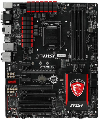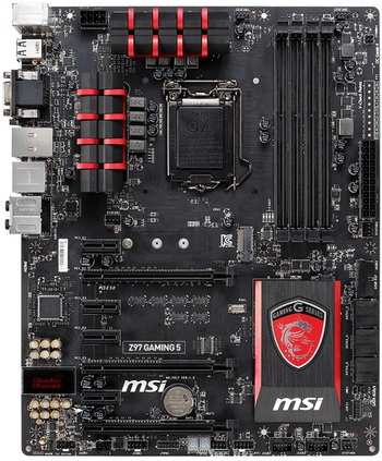 In power system board Z97 Gaming 5 has eight phases. There are three slots PCI Express 3.0 x16 slots and four PCI Express 3.0 x1, connector M.2, four slots for memory, six SATA 6 Gb / s and 2 Audio Boost.