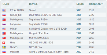 It is interesting that the fight had also joined the owners of devices based on  NVIDIA Tegra 4 processor. Virtually identical results demonstrate Mobilegeeks and Lazycamel - they used tablet Tegra Note (cores frequency 1810 MHz).  And the first place still occupies FTLAUDMAN score with a score of 3171, obtained with the help of a portable gaming device Shield.