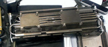 This cooler will combine ten heatpipes larger diameter (although the photographs show not all of them) and three fans with PWM control (two 100 mm and one 92 mm).  On the reverse side of the board provides reinforcing plate.