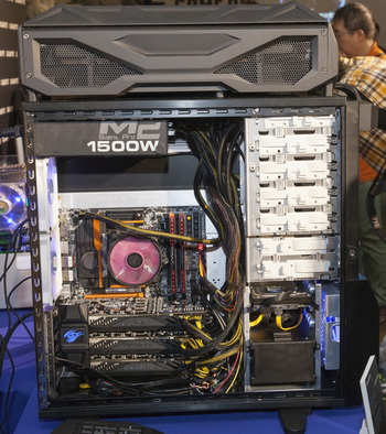 Gigabyte also showed liquid cooling system WaterForce. More precisely, WaterForce represents the whole complex, which is able to work with three graphics cards simultaneously. The system allows you to monitor the temperature of the graphics accelerators and control the operation of pumps and fans involved. Unfortunately, the available pictures did not provide the opportunity to consider the device water-blocks (for the demonstration were involved in the GeForce GTX 780 Ti).