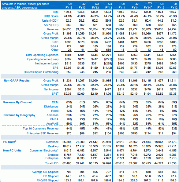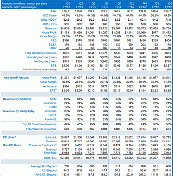 If Seagate sold 55.2 million hard drives during the quarter , then Western Digital shipped 60.4 million drives. The average selling price  in Seagate was higher: $ 61 per share , compared to $ 58 from Western Digital. Total revenue for Western Digital quarter was $ 3.7 billion , net income of $ 375 million , the profit rate was equal to 28.6%. This is slightly worse than the same period last year , but still higher than  Seagate, except for net income ($ 395 million). It turns out that at a lower average cost of a Western Digital drive manages to maintain margins at a higher level compared to Seagate (28,2%).