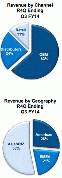 During the quarter Western Digital could fetch $ 134 million from the sale of enterprise-class SSDs. About 53% of total revenue received from Western Digital segments are not directly related to personal computers. Distribution of revenue sources and geographic regions shown in the following two charts: