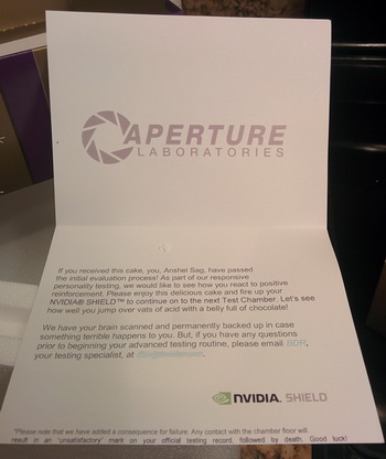 NVIDIA showed a chocolate cake with a covering letter, clearly hinting at communication Shield game console and computer game Portal.
