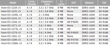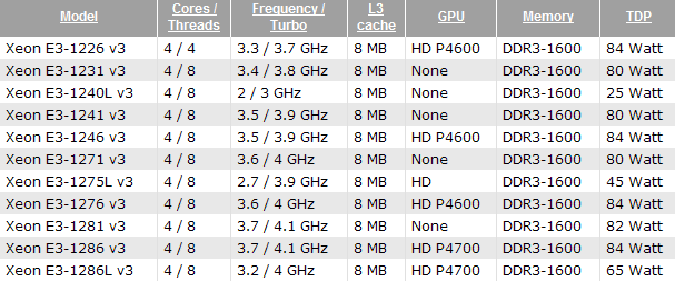 Full list of new processors Xeon E3-1200 v3 and their characteristics, you can see in the table above.