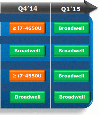 So, as we found out in the mobile segment Broadwell first processors will appear in the fourth quarter of this year, but their expansion is not uniform: first they will be prescribed in the most efficient classes of processors. In particular, a family of mobile processors "U" (28/15 W) and "Y" (11.5 W) faster models Broadwell in the fourth quarter, but the family of "H" (37/47 W) have to wait until the first quarter of 2015 .