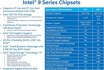 The chipsets ninth series will implement support for SSDs M.2 and wider dissemination of ports SATA Express, take advantage of them for their intended purpose can be no earlier than the second quarter of 2015, when the appropriate drives will appear. In the meantime, these ports can be connected to conventional drives with interface SATA - , compatibility is provided. Intel RST technology grew to version 13, it now supports drives with interface for PCI Express. Moreover, in the corporate sector motherboard manufacturers can promote the function of protecting the boot sector virus attacks Intel Device Protection with Boot Guard.