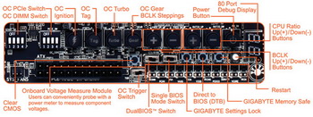 Motherboard Gigabyte series SOC (Super Overclocking) have a number of features that should facilitate the overclock process and reaching new records. First, a panel OC Touch, which has a plurality of switches, buttons, configure, enable, clearing CMOS, debug and point indicator for measuring voltages.