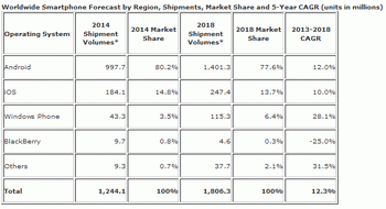 Operating system Windows Phone, on the contrary, strengthens its position.  In 2014 compared with 2013 year supply growth of smartphones running Windows Phone will be 29.5% or 43.3 million units.  In 2015, may be sold 65.9 million units Microsoft and up to 115 million in 2018.  BlackBerry company is not regarded as a growing.  In 2014, it will reduce sales by 49.6% to 9.7 million smartphones in the year.  By 2018, annual sales of BlackBerry devices will reduce to 4.6 million units.