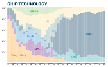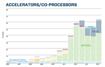 Intel processors in TOP500 systems in 85.4%, IBM solutions occupy 8% and AMD controls 6%  .  A total of 62 systems from the list use accelerators calculations   based on 44 supercomputer solutions NVIDIA, 17 -  coprocessors Intel Xeon Phi, and involve only two cards AMD.