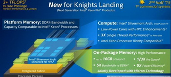 At the heart of Knights Landing lie computational core microarchitecture Silvermont, familiar from mobile platforms Bay Trail and Merrifield. Cores are not specified, but, according to some information, there are 72 pieces. Interestingly, the boosters will use memory type Hybrid Memory Cube (HMC), the initial stages of its volume can reach 16 GB. In Knights Landing applied interconnect technology Omni Scale Fabric, different from True Scale Knights Corner accelerators and based on InfiniBand.