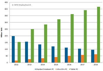 NPD DisplaySearch analysts report that in the first quarter of this year, total notebook shipments was larger than expected due to the termination of official support for the operating system Windows XP.  But the supply of tablets, in contrast, has slowed.  Moreover, for the first time quarterly sales of tablets decreased compared to last year.