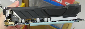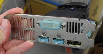 On the back of the card are outputs DisplayPort, DVI and HDMI (two pieces). Two ports HDMI, by the way, it is convenient in terms of connectivity card for consumer video equipment.