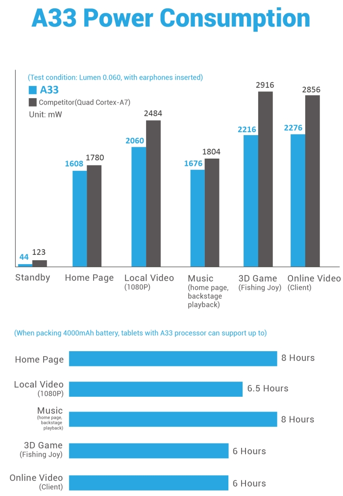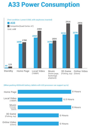 The low power consumption of Allwinner A33 is  according to the presented histograms, it is lower than that of analogues based on the same quad-core Cortex-A7.  Tablet, equipped with a battery capacity of 4000 mA · h, based on A33 can work up to 300 hours of standby time, more than six hours when playing back 1080p video, and eight hours of music playback.