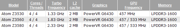 Moorefield generation processors are dual-channel memory controller with support for standard modules LPDDR3-1600.  Graphics core models - a PowerVR G6430 at a frequency of 457 MHz.  GPU frequency models Z3560 and Z3580 can dynamically grow up to 533 MHz.  In addition to the built-in signal processing microprocessor for static graphics embedded in the model unit for video stream processing, cryptographic module and popular interfaces including USB 3.0, SDIO and SPI.
