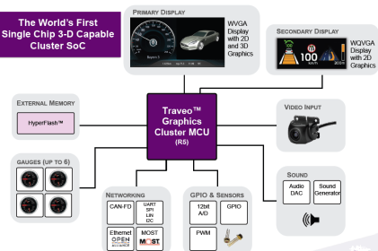 The new Spansion microcontroller series Traveo architecture uses ARM Cortex-R5 and fast interface HyperBus for memory. Integrated graphics with support for 3D for the first time allows Spansion products work without a dedicated graphics needs "external" memory, and significantly speeds up the processing of images. Opportunities microcontroller enough for the trip computer, and for the entertainment system, which is saving the budget for the development of e-filling of a modern car.