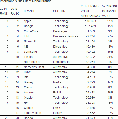 In the top rating for the current year, two companies of the technological sector, have a significant impact on the lives of those who use electronic devices and computer programs. At the top of the list of hundreds of brands is Apple, whose brand is valued at $ 119 billion. - 21% more than last year. At second place is Google Inc. with the cost of the brand $ 107 billion., And annual growth of 15%. By the way, this is the first case in the history of rating Interbrand, when the two companies gained value brands more than $ 100 billion. As for Apple and Google, they headed the rating in the previous year, just so they cost less. In the third place, by the way, the company Coca-Cola, fourth and fifth places are occupied by IBM and Microsoft, respectively. Thus, in the top five four trade marks are related to computer technology.