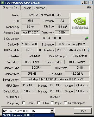 In the test, 3DMark2001 SE result obtained was 83,756 points, which corresponds to the first place in a subset of the GeForce 8600 GTS.