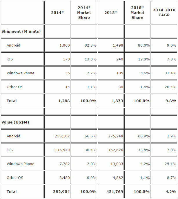 If we talk about the balance of power among the operating systems, in quantitative terms, Android by 2018 will fall from the current 82.3% to 80% of the market,  iOS will also lose ground (13.8% -> 12.8%).  But Windows Phone strengthened from 2.7% to 5.6%, and other operating systems will strengthen the position from 1.1% to 1.6% of the market.