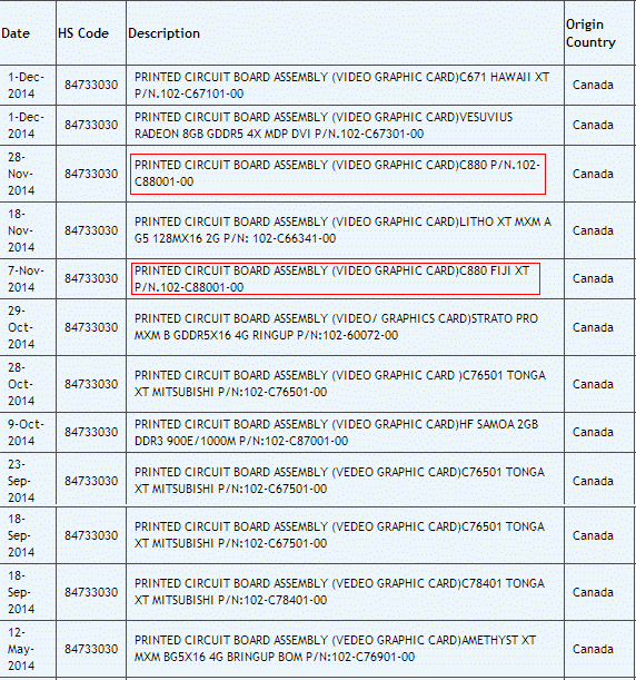By the way, the video card Fiji XT sometimes appear in customs operations in India under the symbol "C880".  From October to the database appears mention of a video card with the symbol Samoa,  equipped with 2 GB of DDR3 memory and having frequencies 900/1000 MHz.