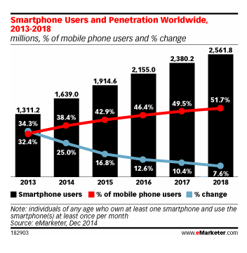 By 2016, the number of smartphone users will reach 2 billion. By 2018, more than half of mobile phone users worldwide will be smartphones.