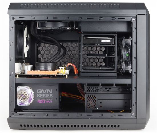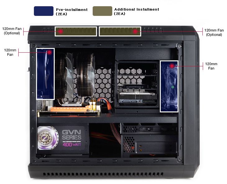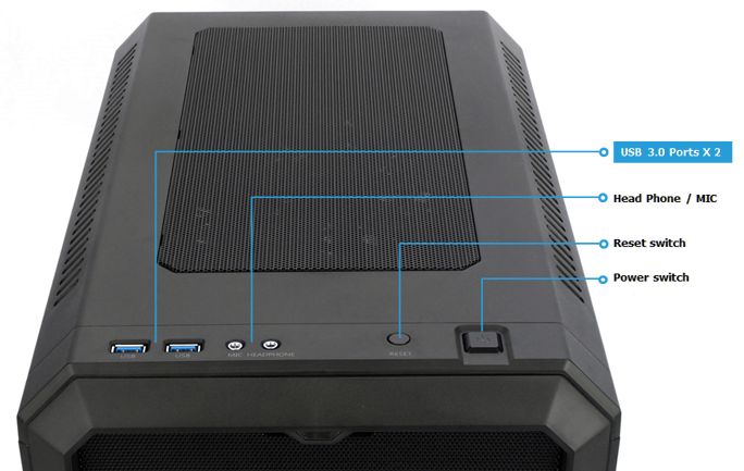 On the top panel has two ports USB 3.0, audio connectors, power  and reboot button.  The case is initially equipped with two fans .