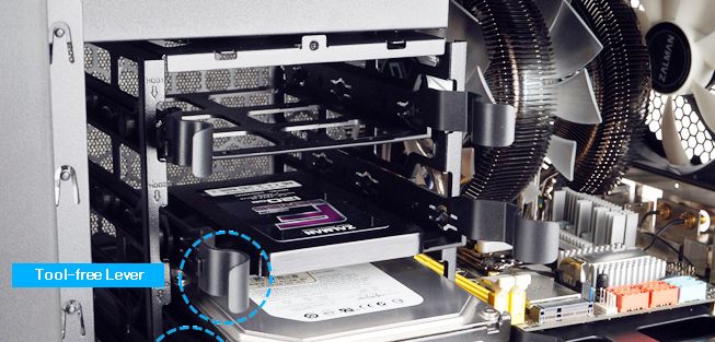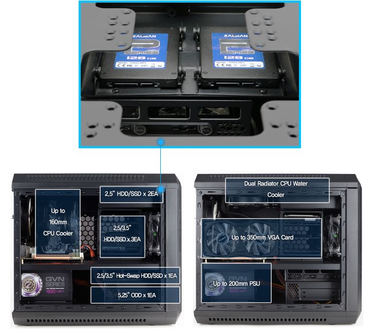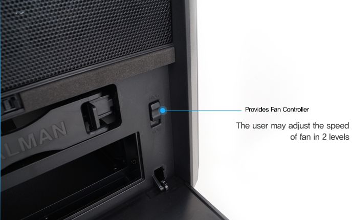 As the advantages of the new case Zalman indicates the possibility of installation of four 120-mm fans and the presence of a two-level preset speed control, setting HDD 3.5 "takes place on special antivibration mounts, implemented the ability to hot replacement HDD / SSD, implemented channels for laying of cables , seat for an additional power supply is equipped with anti-vibration inserts.
