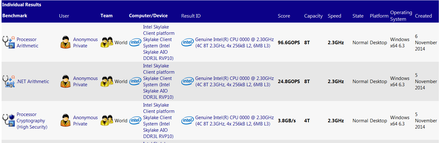 The database SiSoft Sandra Benchmarks revealed processors Intel Skylake.  We are interested in the figures gathered under two categories: