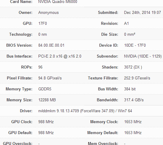 Colleagues suggest that Quadro M6000 GPU will receive GM200  Maxwell  generation with a 384-bit bus and 12 GB GDDR5 memory  .  The number of stream processors will reach 3072 units, the number of blocks texture sampling explicitly stated (256 or 192 pieces), the number of ROP units will reach 96 pieces.  Limited frequency moderate values (988/6612 MHz), which is quite natural for mobile graphics accelerator.