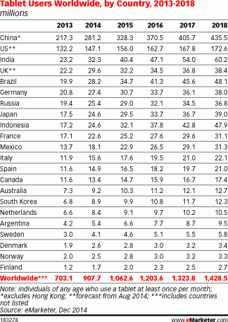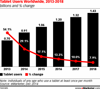 eMarketer Forecast , about 1 billion tablet users. In the current year. In statistics considered residents of the planet of all ages who at least once a month use the tablet. . In other words, almost every seventh inhabitant of the planet at least once a month use tablet. Three years ago the figure was almost twice lower. By 2018, the number of tablet users should grow to 1.43 billion., But the rate of growth of this figure fell to 7.9%.