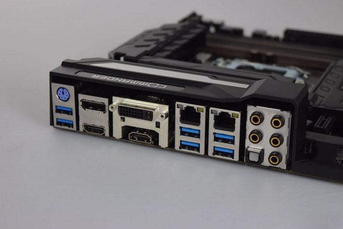 We can note the presence of six SATA 6 Gb / s ports and two SATA Express, six ports USB 3.0, two Gigabit Ethernet (the board has a controller Killer NIC) and a good set of video ports.