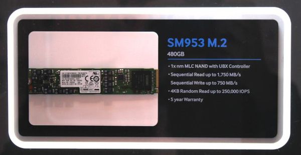 Samsung SM953 made in the form M.2 interface and is equipped with PCI-Express. However, unfortunately, the performance level is lower than that of the retail SM951, in particular, on reading promised to 1750 MB / sec, and writing - 750 MByte / s, suggesting  the use of four lines of PCI-Express 2.0.  But there is a chain of capacitors, ensuring data integrity in the event of an unexpected power outage.