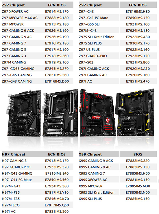 MSI has published on its website a news story, which it notifies scale microcode update your UEFI BIOS motherboards: a total of 40 models on chipset Intel X99 (LGA2011-3), Intel Z97 (LGA1150), Intel H97 (LGA1150 ) are available new firmware versions .