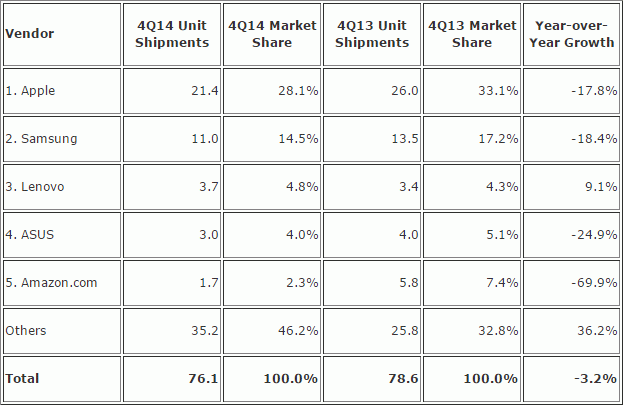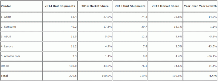IDC found that even a decrease in sales of tablets to 3.2% in the fourth quarter did not prevent the tablet market at the end of the year to grow by 4.4% to 229.6 million sold Units.