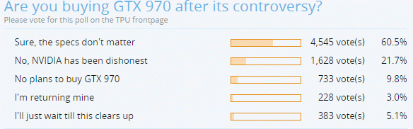 7312 people were able to choose from five options. It is interesting that 60.5% of the respondents deny the existence of problems with the characteristics of GeForce GTX 970 - they are willing to buy it, because the characteristics is not as important as the actual performance level. 21.7% more willing to abandon the purchase of GeForce GTX 970 because NVIDIA has not been fully honest with consumers. Lack of desire to buy a GeForce GTX 970 without express reasons demonstrate 9.8% of respondents.