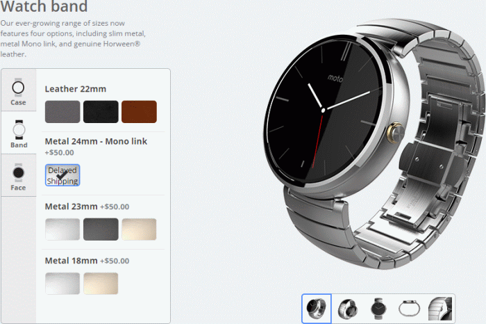 For any of the metal bracelets in two sizes (24 mm and 18 mm) need to pay extra $ 50, compared with a leather strap.  In sizes 24 mm are available black, silver or gold bracelet, narrower bracelets are offered only in gold or silver version.
