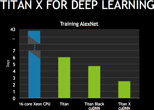 According to the head NVIDIA, video card GeForce GTX Titan X can be successfully used in the self-learning system of recognition of visual images. One of them, AlexNet, using GeForce GTX Titan X reaches the specified parameters for a little over two days, while the GeForce GTX Titan it takes six days, and the central Intel Xeon processor with 16 cores performs the task in 43 days. Moreover, combining in one system four video cards GeForce GTX Titan X, the period of training system can be reduced to 13 hours.