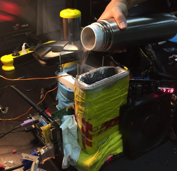 Overclock was implemented in the motherboard Asus Maximus VII Gene, company was the CPU Core i7-4770K, which is also cooled with liquid nitrogen.