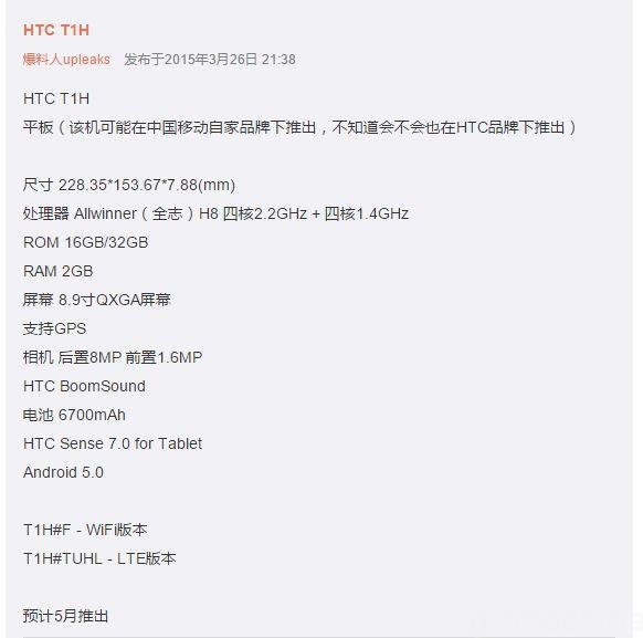 HTC is preparing for the announcement its new tablet, T1H. It will be equipped with 8.9-inch display, whose resolution will be 2048 x 1530 pixels, as well as built-in storage for 16/32 GB, 2 GB of RAM and two cameras: an 8-megapixel primary and 1.6-megapixel front. For autonomy will be responsible 6700 mAh battery, and as the operating system will be Android 5.0 Lollipop interface HTC Sense 7. It is curious that HTC has this time opted for a processor Allwinner, instead of the more traditional solutions Qualcomm and MediaTek. The base of the tablet HTC T1H lie eight-processor Allwinner H8 processor with a clock frequency of 2.2 GHz and graphics PowerVR SGX544, built using 28-nanometer process technology.
