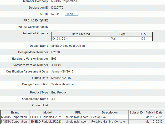 In consumer products Tegra X1 destined to be registered only in the beginning of March , when NVIDIA tried to surprise the publicwith the third in a family unit SHIELD, which combines the properties of a multimedia set-top box and games console. Until now, it was thought that the first carrier Tegra X1 in this segment will be the tablet family SHIELD . March end has come, and the tablet has not yet been presented. However, it is not so bad - in the database supervisor Bluetooth SIG mysterious product family SHIELD with the symbol "P2530" appeared in the middle of this month. In other words, the tablet is based on NVIDIA Tegra X1 was able to get certified Bluetooth.