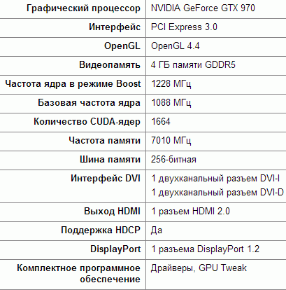 Characteristics of video were released today by the manufacturer , although unofficial sources reported them even last week. Video card Asus GeForce GTX 970 Turbo is equipped with 4 GB of memory type GDDR5 , frequencies are 1088/1228/7010 MHz. On the rear panel, you can find a pair of ports DVI (DVI-I + DVI-D), one port HDMI 2.0 and DisplayPort 1.2.