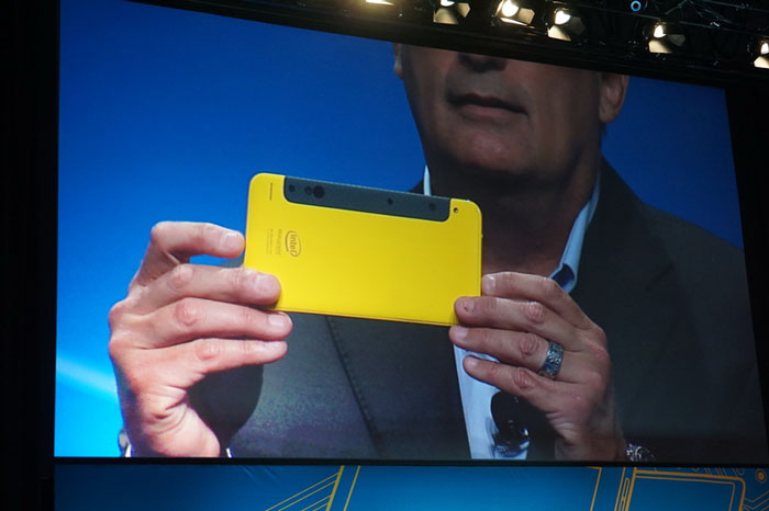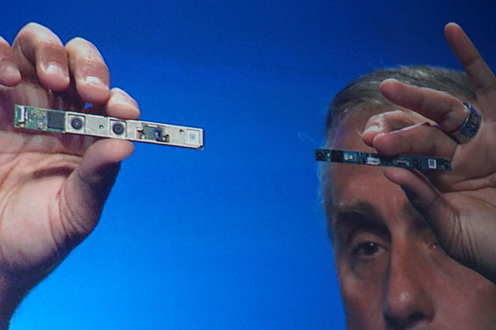 Another prototype - RealSense camera to detect 3D-images - also demonstrated in the form of non-working unit.  First, Intel's director showed a new generation of modules RealSense reduced in size (see photo), and then showed how the new module appears as part of a smartphone.