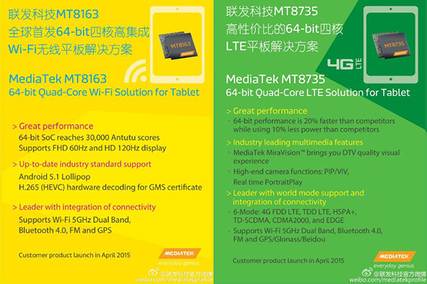 MediaTek company officially announced two new 64-bit quad-core processors - MT8163 and MT8735. Each of them is designed for tablet PCs.