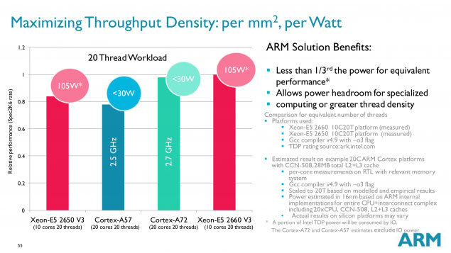 With processors from Intel, ARM directly on the field of energy efficiency. It is clear that we can not directly compare the performance of processors Intel Core M (Broadwell-Y) or Xeon E5 v3 (Haswell). But you can try to compare consumption when performing certain tasks. According to ARM, Cortex-A72 core outperforms several core Broadwell-Y on a background of about four times smaller consumption. Comparison with cores Haswell by Intel Xeon E5 v3 shows a threefold advantage cores ARM Cortex-A72 in terms of maximum throughput per square millimeter crystal surface (W / sq. mm). All of the above conveniently fits in your outline plans to enter the market of laptops and servers.