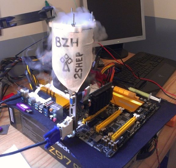 Processor Series Devil's Canyon cooled with liquid nitrogen in the motherboard ASRock Z97 OC Formula, memory G.Skill was used. In order to achieve such frequencies processor had to limit the number of active cores to two.