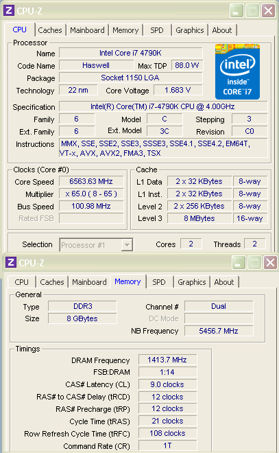 The French enthusiast 2Shep was able to show two the best result for the Core i7-4790K processor tests SuperPI 32M and SuperPI 1M, respectively. In the first case the result was 4 minutes 44.5 seconds, the second - 5.375 seconds. The frequency of the processor has reached 6563 MHz and 6508 MHz, respectively.