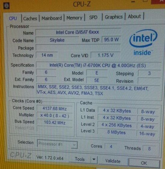 As a bonus a screen capture of utility CPU-Z, which describes the characteristics of the engineering sample processor generation Core i7-6700K Skylake.  In the turbo mode it is capable of operating at frequencies of 4.0-4.2 GHz , the voltage is not greater than 1.175 V, and the TDP level  - 95 watts.